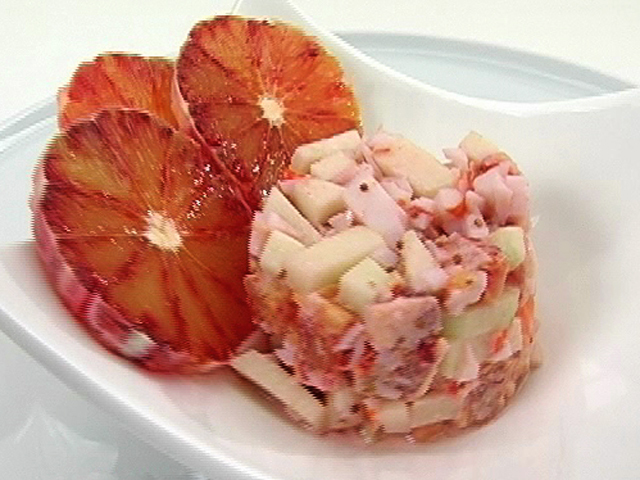 Свежий салат с мясом краба сурими.Состав:апельсины — 3 штуки;яблоко — 1 штука;майонез — 6 столовых ложек;сливки — 4 столовых ложки;сок половинки лимона;паприка — 1 столовая ложка;горчица — 1 столовая ложка;сурими — 350 гр.